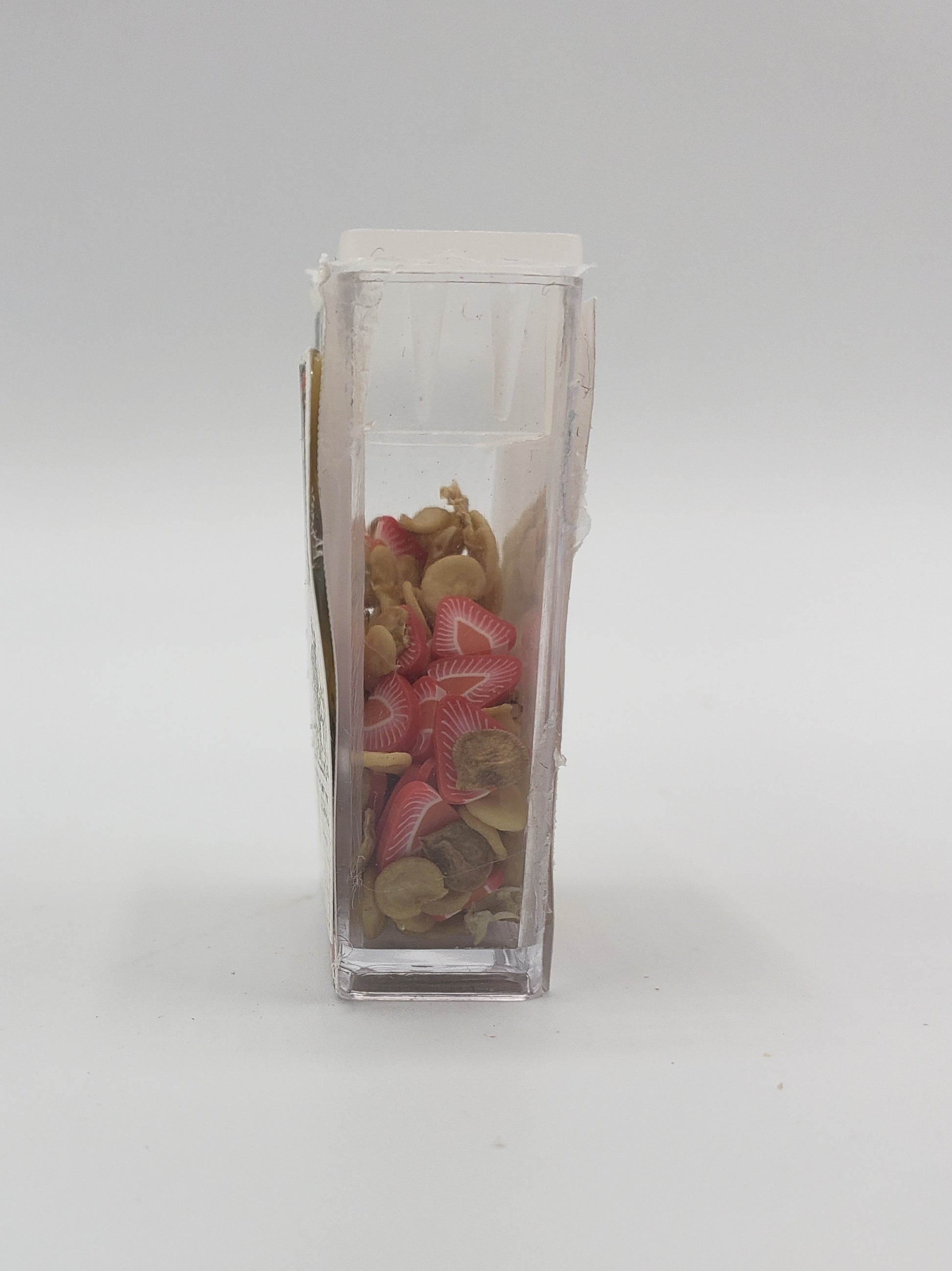 Plastic pourable box is: 1 5/8 of an inch by 1 inch, please note this is a plastic box that has paper glued to the side.