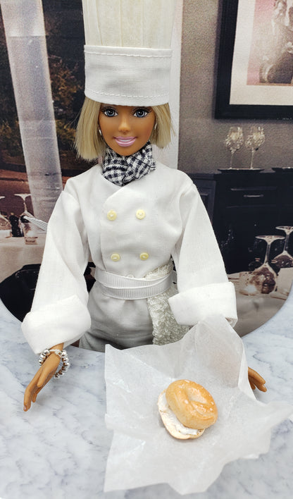Indulge in the delightful world of miniature dining with our miniature bagel with cream cheese. Specially crafted for Barbie-sized dolls, this charming breakfast item elevates your doll's culinary experience. Imagine your favorite doll savoring a taste of breakfast bliss with this hand-made delight from Chef Gina's® Mini Food.