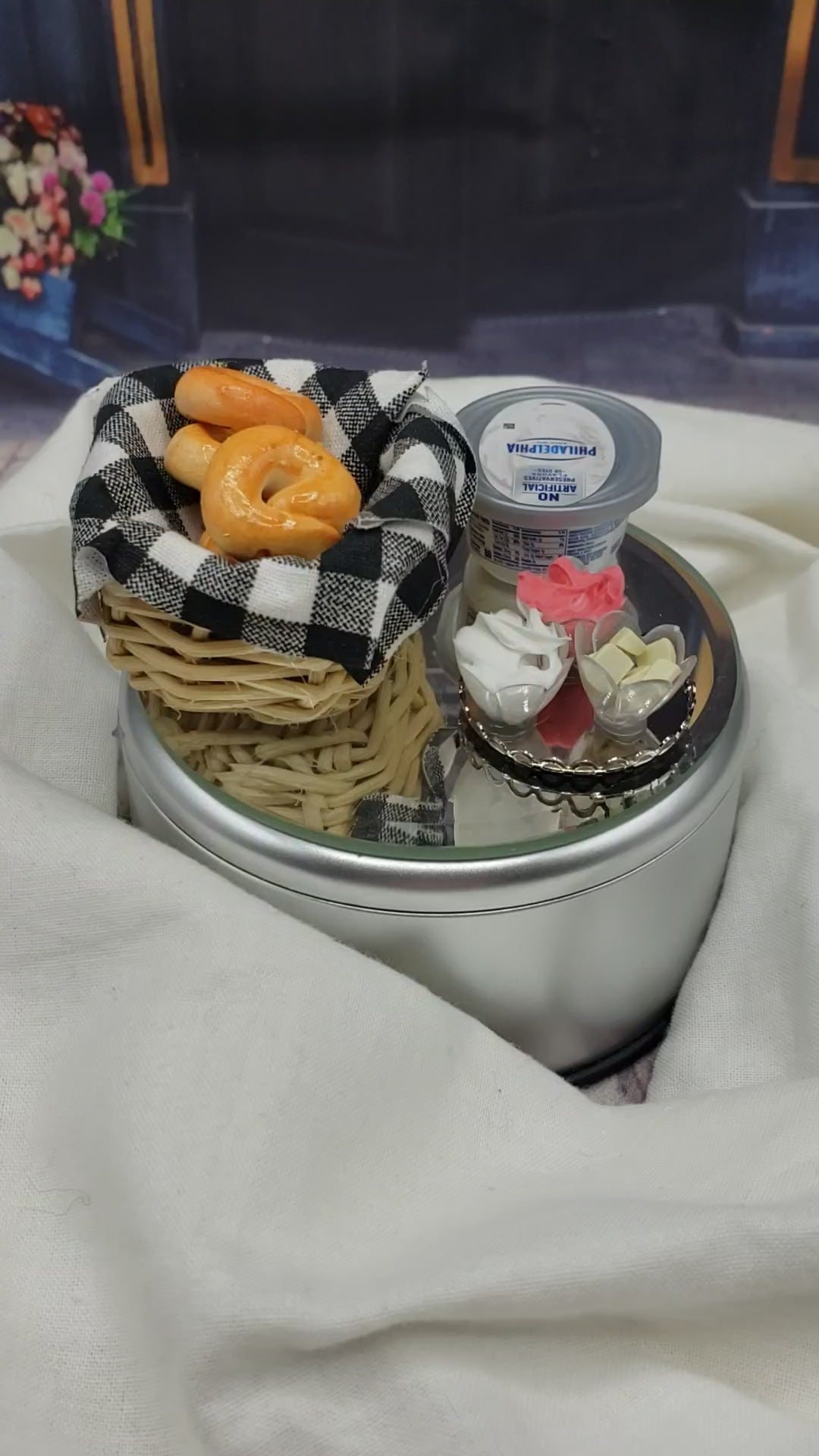 Indulge in the fun of setting up breakfast scenes with ease. The set includes a black and white checked cloth, enhancing the cozy breakfast vibe. Accompanied by a mini cream cheese container, each detail is crafted with precision. Encourage creativity with this delightful miniature bagel basket, which can inspire endless storytelling.